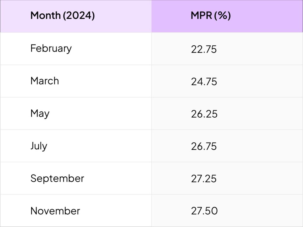 In November of 2024, the Monetary Policy Committee of the CBN convened and adjusted Nigeria’s Monetary Policy Rate (MPR) to 27.5%. This increase of 25 basis points from the previous rate of 27.25% was implemented to regulate inflation and stabilize the economy.